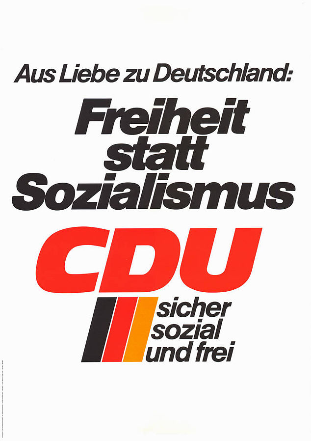 Wieder ein kleiner Zeitsprung. In Abgrenzung zum Unrechtssystem des realen Sozialismus in der DDR heißt es im Bundestagswahlkampf der CDU 1976: “Freiheit statt Sozialismus”.